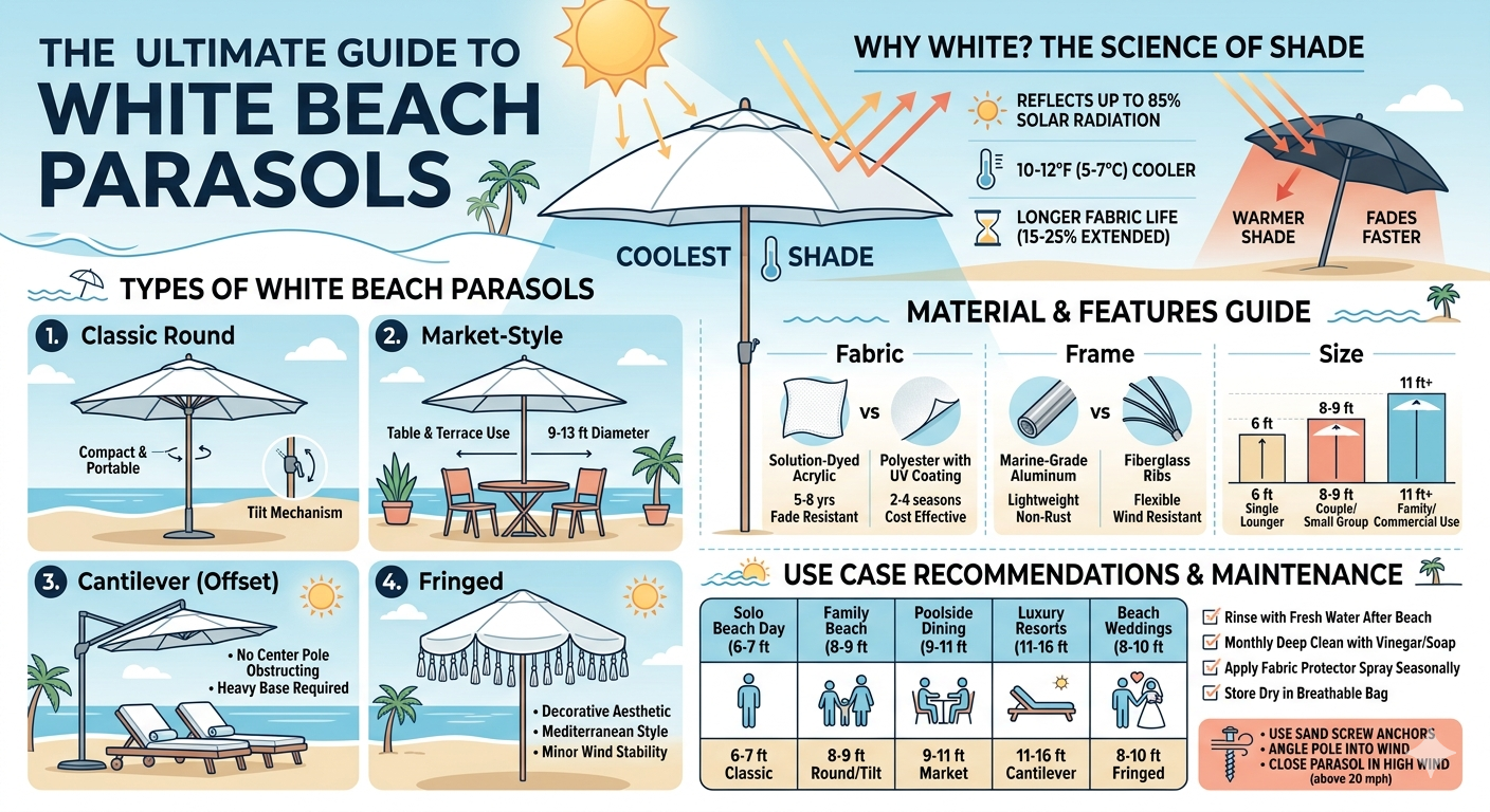 رنگ سفید صرفاً یک انتخاب سبک نیست - از نظر حرارتی کارآمدترین رنگ برای چتر ساحلی است زیرا سطوح با رنگ روشن به جای جذب انرژی خورشیدی، منعکس میشوند.